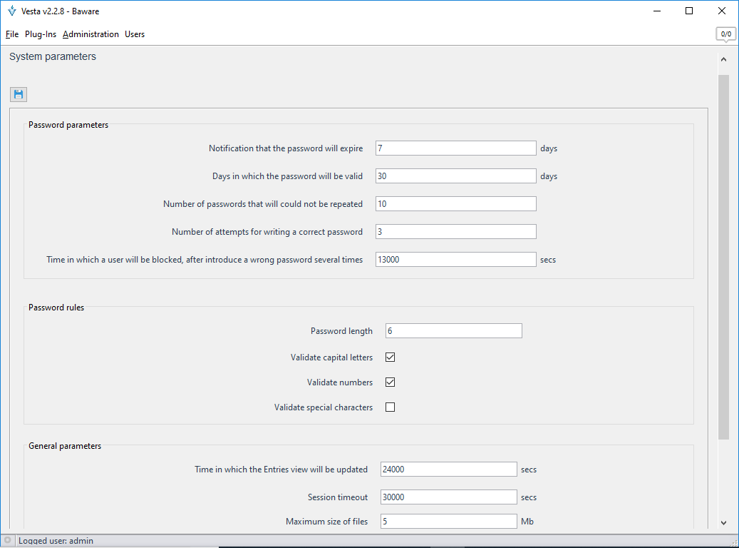 Los criterios de seguridad son establecidos en el menú Administration > System Prameters