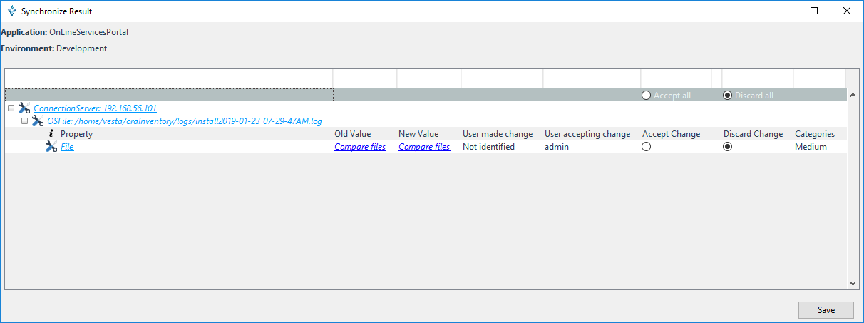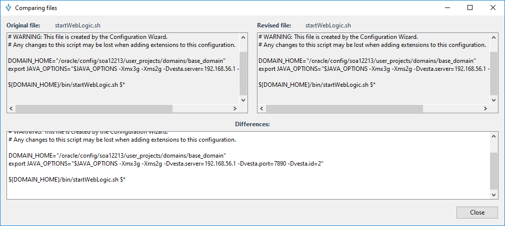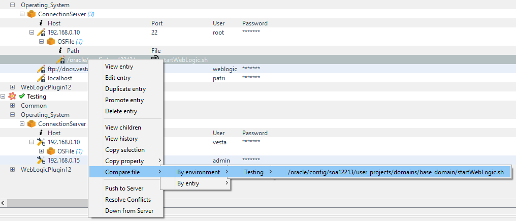 La comparación entre ambientes permite comprara el contenido del archivo contra otro archivo de un ambiente diferente donde se encuentre configurada una entrada de archivo del plugin OS.