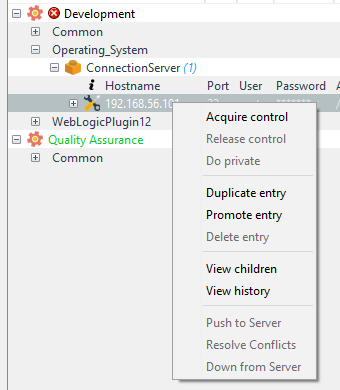 Una vez que han sido definidas las entradas de plugins, se cuenta con una serie de opciones a realizar sobre ellas, estas opciones se encuentran en el menú emergente sobre la entrada seleccionada.
