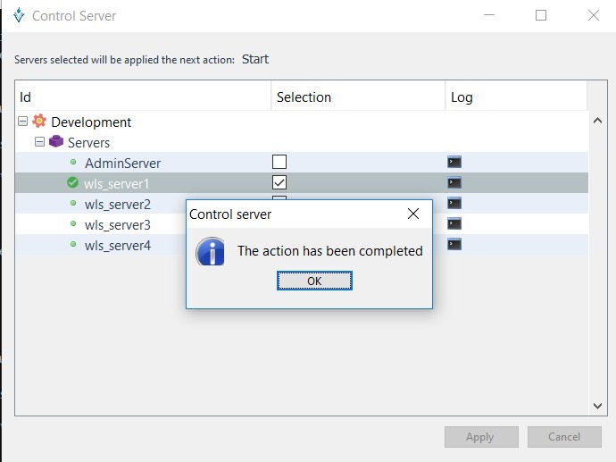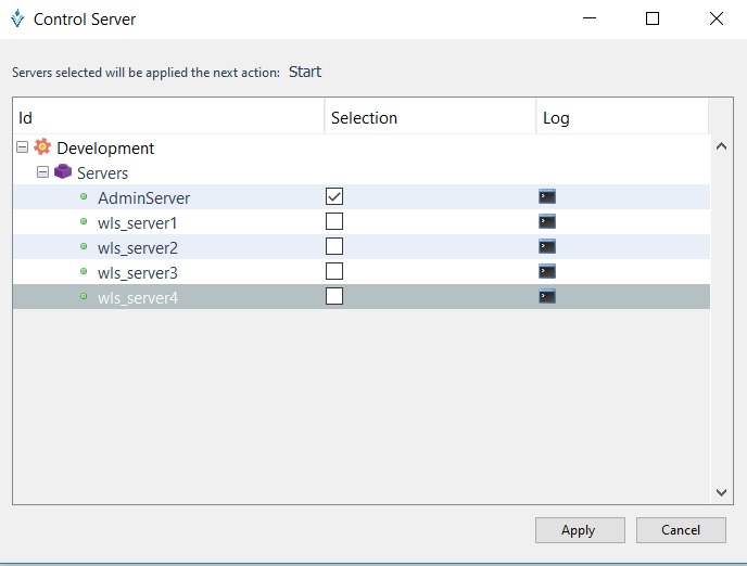 Permite iniciar el servidor, en la columna Selection se debe seleccionar el servidor deseado y se da click en el botón Apply para iniciar.