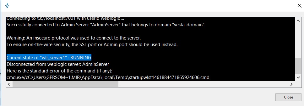 Cuando un cambio en la configuración de WebLogic es realizado, aparece en Vesta una ventana emergente notificando los detalles del cambio realizado.