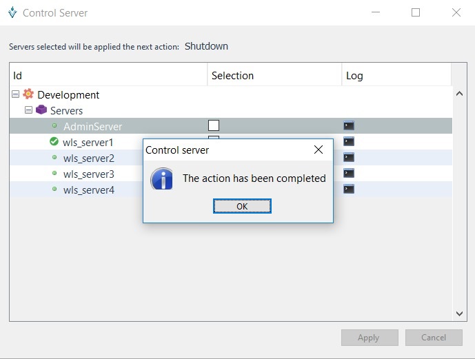 Permite detener el servidor, se elige en la columna Selection y se da click en el botón Apply.