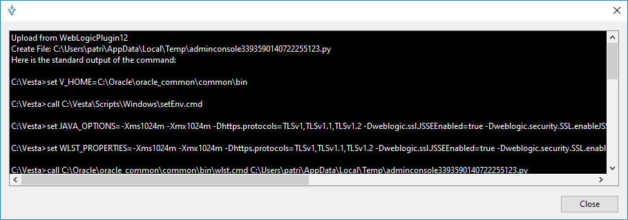 Nota: El identificador de configuración usado en -Dvesta.id se obtiene en Vesta cuando se elige la opción “Plug-ins > Configure” , una vez configurado un WebLogic con una aplicación y ambiente y se guarda, entonces se genera un Id de configuración mostrado en un popup si la configuración fue exitosa, ese id es el que se asigna en este parámetro.